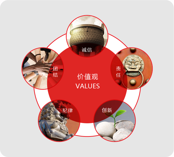 诚信、团结、创新、责任、纪律为我公司的价值理念。